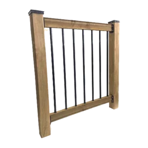| Kit Contents | (2) 6' long pressure-treated brown wooden decorative rails with pre-drilled holes (15) 34" long galvanized steel balusters (black) (4) DRC rail connectors (black) (24) Stainless steel mounting screws |